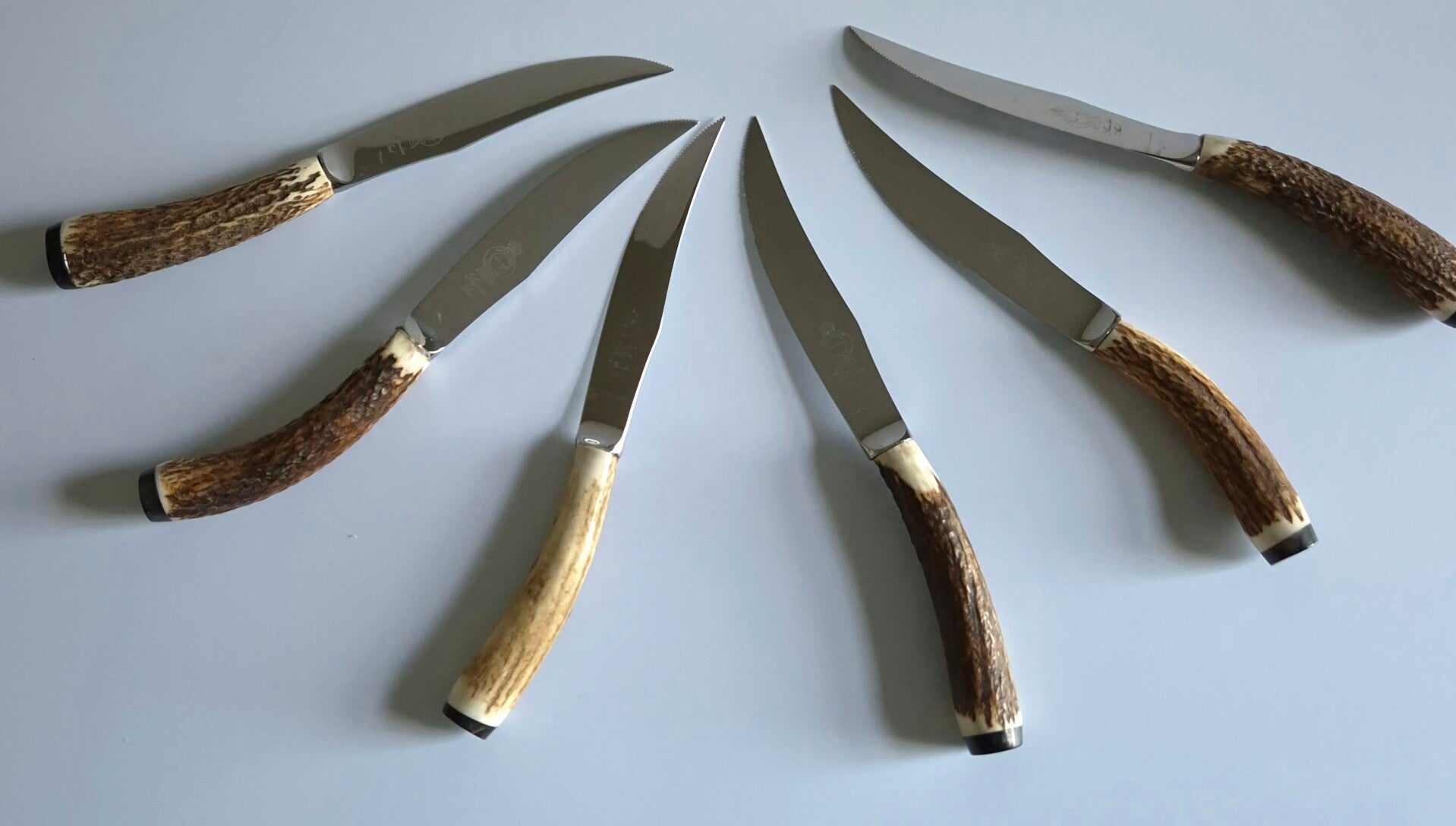 • Presenting our Set of Six Bespoke Antler Handle Steak Knives in a beautifully crafted Wooden Case.
